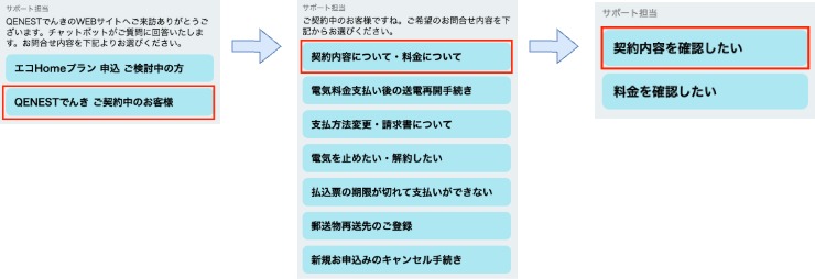 【QENESTでんき ご契約中のお客様】→【契約内容について】→【契約内容を確認したい】をご選択ください。